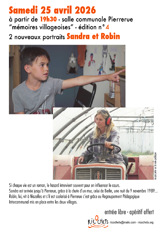 La 4ème édition des Mémoires Villageoises de Pierrerue se déroulera dans la salle communale le samedi 26 avril 2026 à partir de 19h. Deux nouveaux portraits seront évoqués : Sandra et Robin.