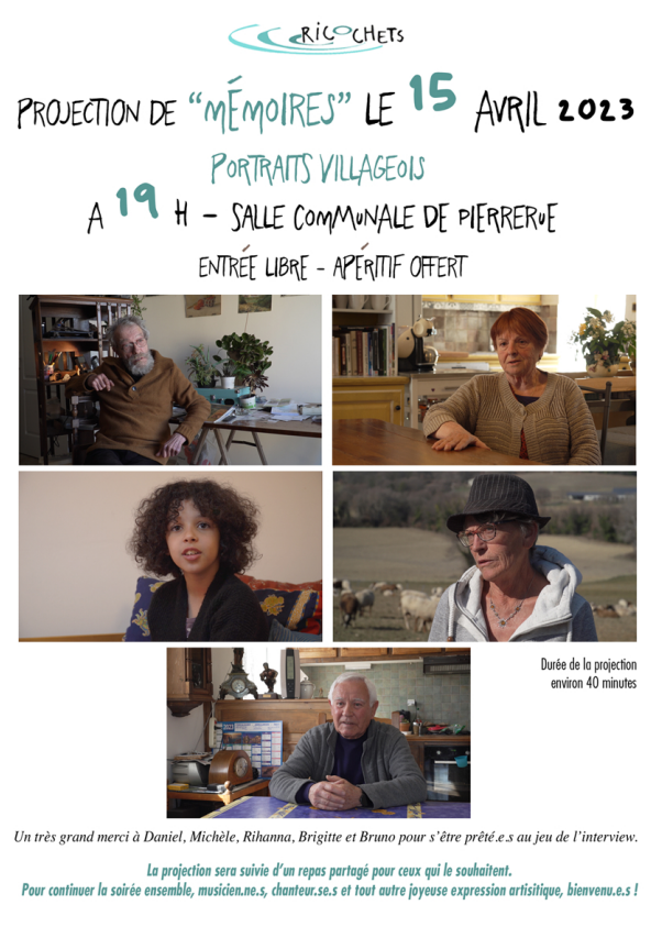 Soirée documentaire « Portraits villageois » Détails de l'événement Date: 15 avril 2023 19h00 – 23h00 Catégories: Ricochets Projection de “Mémoires” : Portraits villageois En salle de Pierrerue, à partir de 19h00 Entrée libre – Apéritif offert